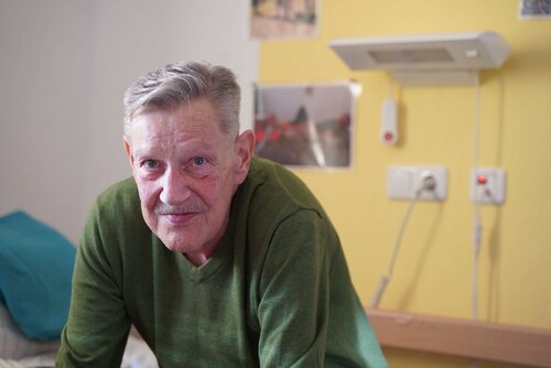 Die Tür zum Zimmer von Herrn Klaut öffnet sich. Ein älterer Mann mit wachem Blick und gepflegtem Erscheinungsbild begrüßt mich. Man sieht Herrn Klaut nicht an, dass er einen palliativen Versorgungsbedarf hat. Nur die Maske, die er zur Unterstützung seiner Atmung trägt, lässt erahnen, dass sein Gesundheitszustand behandlungsbedürftig ist.