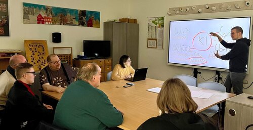 Die Leistungsberechtigten verfolgten die Ausführungen aufmerksam und mit sichtlich großem Interesse. Schon jetzt zeigt sich, dass das Smartboard eine ganz neue Dynamik in den Unterricht bringt. Statt reiner Wissensvermittlung entsteht ein gemeinsamer Lernprozess. Inhalte können direkt bearbeitet, verschoben, ergänzt oder visuell hervorgehoben werden. Das macht abstrakte Themen greifbarer und fördert aktives Mitdenken und Mitmachen. Ob interaktive Übungen, das Einbinden von Videos, digitale Arbeitsblätter oder gemeinsames Brainstorming – die Möglichkeiten sind vielfältig.