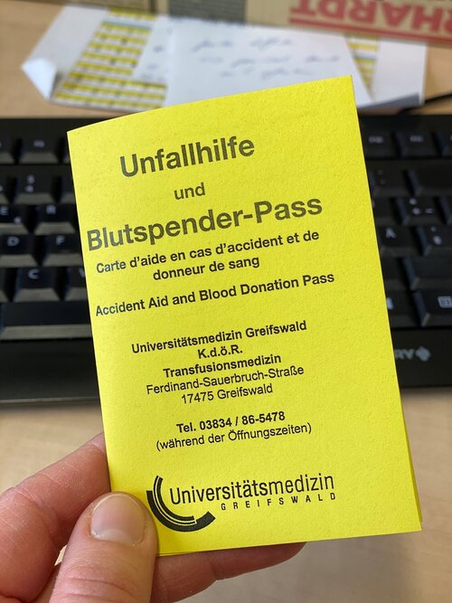 Telefonisch wende ich mich an die Blutspende Greifswald, um einen Termin zu vereinbaren. Die nette Frau am anderen Ende der Leitung gleicht direkt die Datenbank ab, ob ich bereits als Spender erfasst bin. Bin ich. Ich erschrecke mich selbst, dass meine letzte Spende im Jahr 2000! gewesen ist. Meine Güte! Ein schlechtes Gewissen überkommt mich. Auch wenn es in den letzten beiden Jahrzeiten aufgrund von Operationen und Schwangerschaften immer wieder Zeiten gab, in welchen ich nicht spenden durfte, so gab es dazwischen doch Lücken, große Lücken, in denen ich mit meinem Blut hätte Leben retten können.