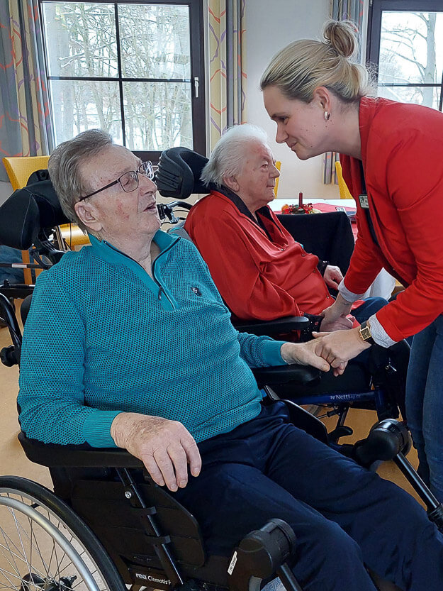 Im Hintergrund arbeiten bereits einige fleißige Helfer*innen in weihnachtlichen Kostümen an allerlei Leckereien für die Speisetafel. Jens Gutknecht, Mitarbeitender des Betreuungsteams, ist gerade dabei, frische Quarkbällchen in der Pfanne zu brutzeln. „Die schmecken wirklich gut, sind noch warm und auch schön weich, sodass unsere Senioren sie gut essen können.“ Seit 2015 arbeitet Herr Gutknecht nun schon im Nikolaiheim. Obwohl er einmal einen technischen Beruf gelernt hat, zog es ihn später beruflich immer wieder in den sozialen Bereich. Etwas anderes könne er sich nicht mehr vorstellen. „Die Betreuung hier im Haus ist schon etwas Besonderes. Wir lassen uns immer wieder neue Dinge einfallen, organisieren Ausflüge und abwechslungsreiche Nachmittage für unsere Bewohner*innen.“ Auch Pflegedienstleitung Julia Klöse kann das nur bestätigen: „Die Veranstaltungen planen die Mitarbeitenden so ziemlich alleine, darauf kann man sich wirklich verlassen. Sie haben immer wieder schöne Ideen. Für mich ist das eine große Unterstützung.“