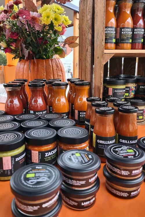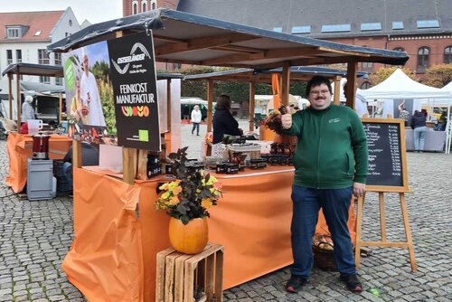Mit einem Gemeinschaftsstand, organisiert durch Gutes-Aus-Vorpommern, präsentierte unsere Feinkostmanufaktur am vergangenen Wochenende ihre leckeren herzhaften Brotaufstriche und Soßen sowie süßen Fruchtmarmeladen. Renner waren Zungenbrecher wie Zacusca und Baba Ghanoush, der Rote-Bete-Ketchup und die Grillsoße. Ob Bärlauchmix oder das edle Pralinensortiment, alle Produkte wanderten in zahlreiche Einkaufstaschen. Neue Kund*innen, aber auch Stammkundschaft aus unseren Läden sorgten für reißenden Absatz. Unser Mitarbeiter, Herr Hauser vom Hotel Ostseeländer, mittlerweile der Marktstandverkaufsprofi, hatte alle Hände voll zu tun. Ihm gilt unser besonderer Dank.