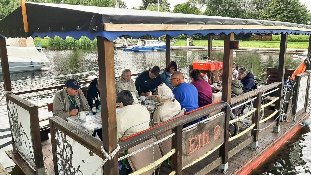 In diesem Sommer wurde daher eine Floßfahrt auf der Peene angeboten. Acht der Bewohner:innen konnten daran teilnehmen. Diese wurden durch vier Mitarbeitende des Pflegeheims begleitet. Der Ausflug führte die Teilnehmenden von Menzlin nach Stolpe, wo es eine Pause bei leckerem Kuchen und Kaffee gab. Da es an diesem Tag warm war, genehmigten sich einige der Bewohner:innen auch noch ein kühles Bier und stießen gemeinsam auf den schönen Tag an. Nach der Kaffeepause brachte das Floß alle wieder zurück nach Menzlin, wo bereits die Kohlen auf dem Grill glühten, da noch ein gemeinsames Grillen geplant und vorbereitet war. Nach der vielen frischen Luft hatten alle Teilnehmenden Hunger und freuten sich über selbstgemachte Salate, Steaks, Bratwürstchen, Pommes, Pilze und vieles mehr. Nach der ausgiebigen Stärkung traten am Abend alle die Heimreise an. Eine Mitarbeiterin verriet uns: „Die Bewohner:innen schwärmen heute noch von diesem Ausflug.“