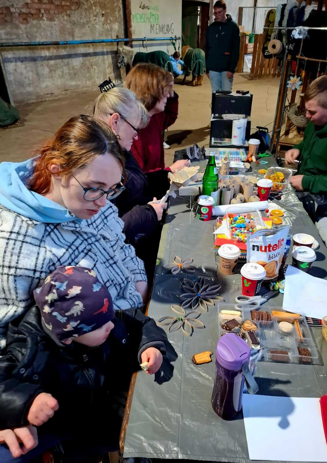 Unsere Kooperationspartnerin Juliane Lebich hat sich etwas Besonderes einfallen lassen. Für die Kleinsten war Ponyreiten angedacht und Kontaktaufnahme zu den Tieren. Die Mamas sollten sich einfach Zeit für sich nehmen und beim heißen Kakao und Wärmekissen konnten sie so einmal schöne Dinge wie Sterne und Lichterhäuschen für sich anfertigen und im Hintergrund erleben wie glücklich und entspannt die Kleinen sind.