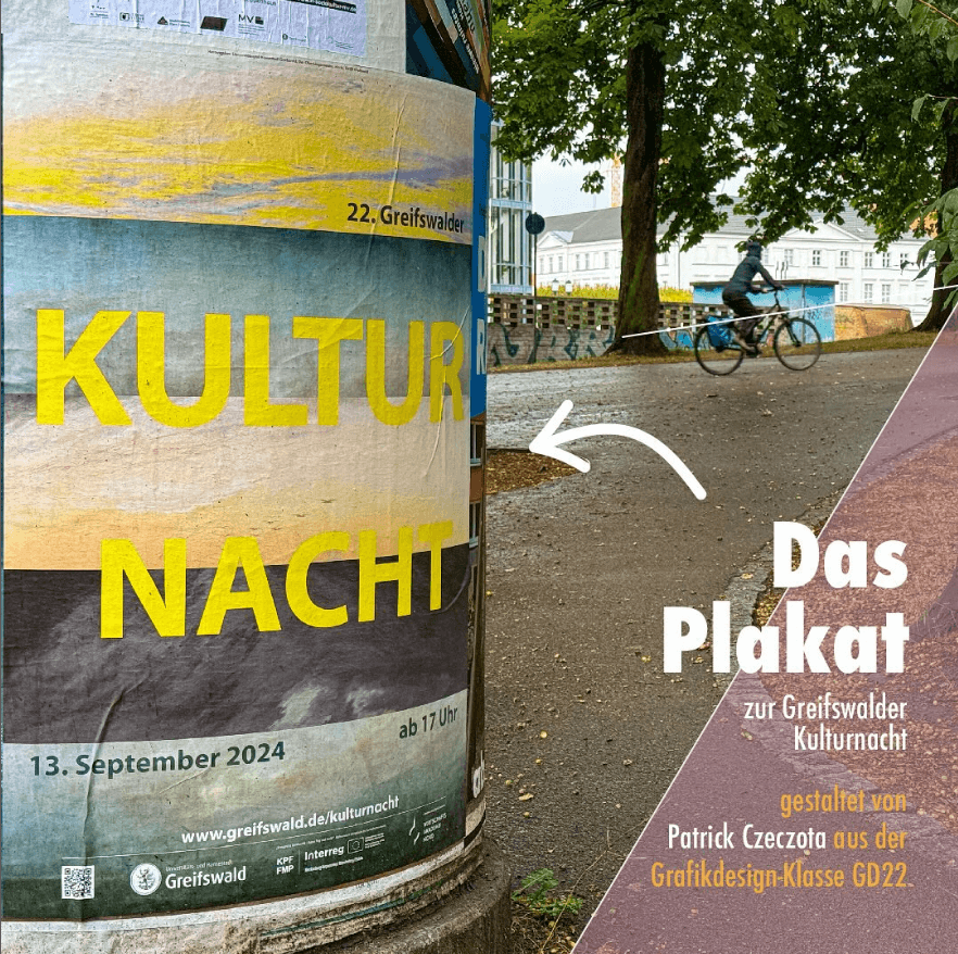 Vor rund einem Monat hatten die Schüler des 2. Fachjahres im Bereich Grafikdesign der Wirtschaftsakademie Nord die aufregende Möglichkeit, ihre kreativen Ideen für das Plakat zur Greifswalder Kulturnacht zu präsentieren. Mit viel Engagement und künstlerischem Feingefühl entstanden beeindruckende Entwürfe, die die Atmosphäre der Veranstaltung perfekt einfangen. In einem früheren Post haben wir bereits über die Präsentation und die verschiedenen Designvorschläge berichtet.