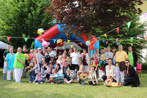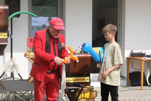 Nach gründlicher Vorplanung und Organisation fand am 05. Juni 2025 im Senioren- und Wohnzentrum am Botanischen Garten in Greifswald ein Kinderfest für alle Kinder und Enkelkinder unserer Mitarbeitenden am Standort statt. Neben einem bunten Programm mit Zauber-Show, verschiedenen Geschicklichkeitsspielen, Hüpfburg, Luftballonmodellage, Musik und Malstrecke, gab es auch allerlei Leckereien in Form eines Kuchenbuffets, frisch gegrillter Bratwurst, Süßigkeiten und Softeis. Da das Wetter sich – trotz Befürchtungen von auftretendem Regen und vormittags durchweg grauem Himmel – dann doch noch hielt, konnte im Innenhof zwischen Haus A und B ausgiebig gefeiert, gelacht, gespielt und geschlemmt werden.