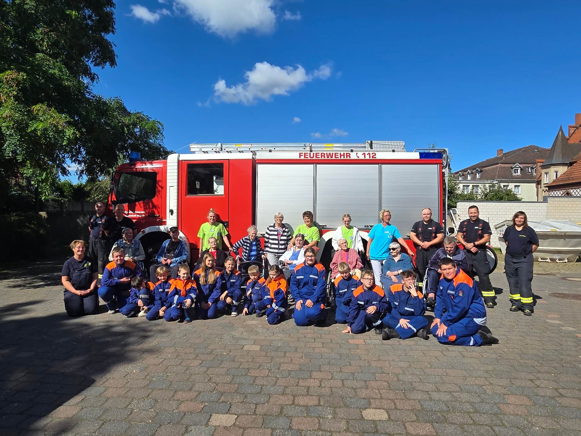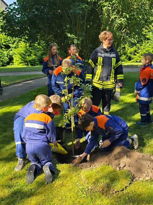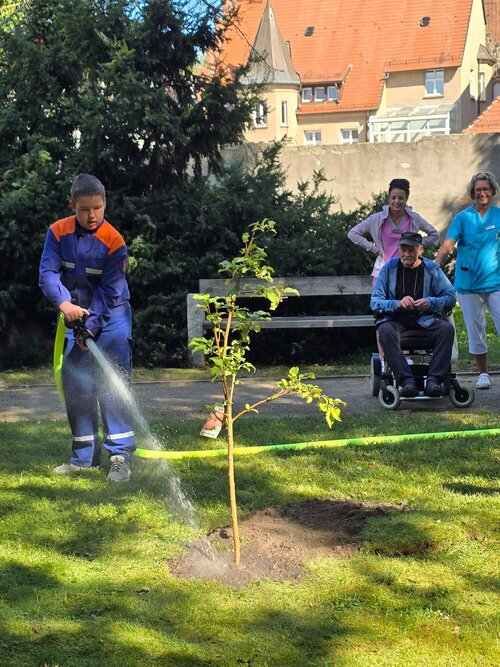 Am vergangenen Sonntag wurde nun auch die Jugendfeuerwehr der Stadt Demmin von der Jugendfeuerwehr Dargun und der Feuerwehr Loitz nominiert. Nach kurzem Überlegen entstand die Idee, das Bäumchen in der Parkanlage des Gertraudenstifts zu pflanzen. Die Freude über diese Nachricht war in der Einrichtung groß! So rückten nach einer kurzen Absprache am 21. August drei Fahrzeuge der Feuerwehr im Demminer Pflegeheim an. Dabei waren die Jugendfeuerwehr (Jugendliche im Alter zwischen 10 und 16 Jahren) und die „Löschzwerge“ (Kinder im Alter von 6 bis 10 Jahren). Begleitet und angeleitet von erwachsenen Vertreter:innen der Feuerwehr, setzten sie ihren Beitrag zur Baumpflanz-Challenge kurzerhand unter Beifall der anwesenden Mitarbeitenden und Bewohner:innen in die Erde. Anschließend wurde natürlich wieder per Video-Botschaft nominiert. Daher dürfen sich nun die Jugendfeuerwehren aus Malchin, Völschow und Warrenzin auf den Weg machen, um die Challenge zu bestreiten.