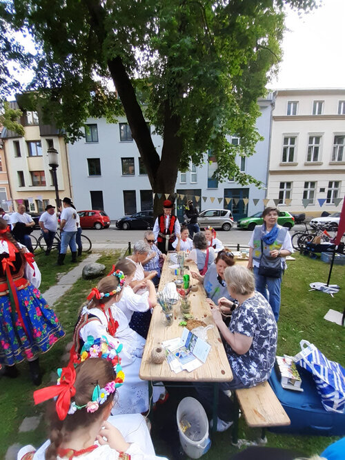Schon der Auftakt war fulminant: Gleichzeitig hielten das Theater Vorpommern – in prächtigen Romeo-und-Julia-Kostümen – sowie die Folkloregrupp „Ina“ aus Greifswalds Partnerstadt Goleniów Einzug. Nebenbei übte der Kinderchor auf einer Picknickdecke noch mal für seinen Auftritt. Letzte Vorbereitungen an den Info-Ständen wurden getroffen und erste Kuchenstücke verzehrt.