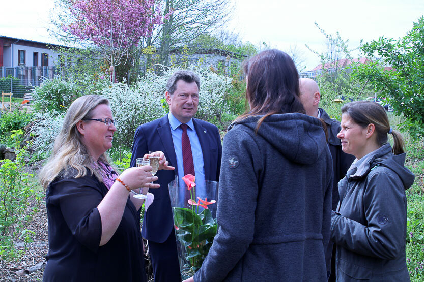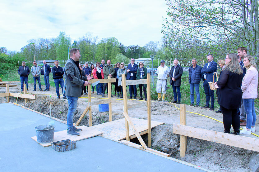 Schon vor einigen Jahren war der Gedanke an ein "Fährhaus II" in Stralsund in Nachbarschaft zum Jugendhilfezentrum Strelahaus der Norddeutschen Gesellschaft für Bildung und Soziales (NBS) gereift. Grund war die Feststellung eines besonderen Bedarfes, der sich im Rahmen der Kooperation mit der Kinder- und Jugendpsychiatrie des Klinikums Stralsund gezeigt hat. Und während an der Wohngruppe "Fährhaus" bereits seit einiger Zeit fleißig gewerkelt wird, wurde für das neue Gebäude "Fährhaus II" am 06.05.2022 in einem kleinen festlichen Kreis der Grundstein gelegt. Neben den Kollegen und Kolleginnen aus der Kinder- und Jugendpsychiatrie und der Ernst-von-Haselberg-Klinikschule waren auch das Jugendamt vertreten sowie Mitarbeiter:innen aus der NBS, der Unternehmensgruppe Pommersche Diakonie, die Architekten und Bauleiter.
