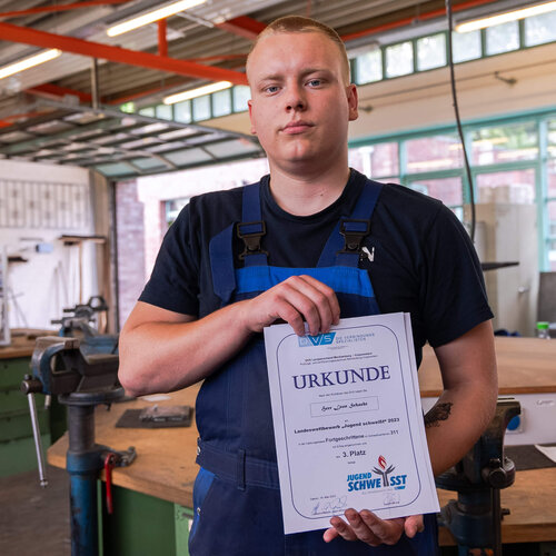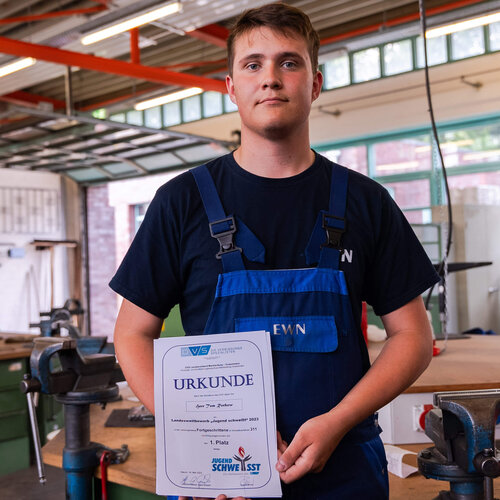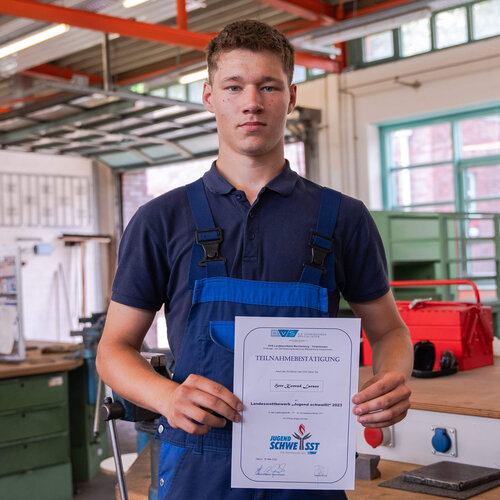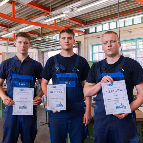 Neben Herrn Rochow konnten auch die angehenden Industriemechaniker des Entsorgungswerkes für Nuklearanlagen (EWN) Leon Schacht und Konrad Larsen mit ihren guten Platzierungen (3. und 4. Platz) glänzen. Insgesamt haben 16 junge Teilnehmer:innen in 4 verschiedenen Verfahren (Autogen-, Metallaktivgas-, Wolfram Inertgas- & Lichtbogenhandschweißen) an den Landesmeisterschaften teilgenommen. „Die hervorragenden Leistungen von Herrn Rochow sind nicht zuletzt auf die Unterstützung und mentale Vorbereitung durch die Ausbilder im BBW zurückzuführen“, betont Stefanie Wordell, Verantwortliche für die Personalbetreuung und -entwicklung der EWN Entsorgungswerk für Nuklearanlagen GmbH. Die nächste Etappe für Tom Rochow wird die Teilnahme am Bundeswettbewerb sein. Erste Unterlagen, darunter Schweißanweisungen, sind bereits bei den Ausbildern eingetroffen und werden in den kommenden Wochen intensiv mit Herrn Rochow vorbereitet.