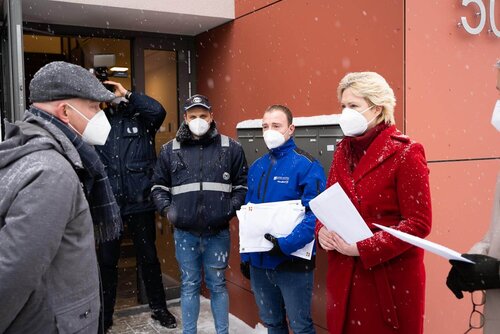 Im Kampf gegen die Corona-Pandemie lässt die Landesregierung seit dem heutigen Dienstag FFP2-Masken an alle Haushalte in Mecklenburg-Vorpommern verteilen. Zum Auftakt unterstützten Ministerpräsidentin Manuela Schwesig zusammen mit Patrick Dahlemann, Parlamentarischer Staatssekretär für Vorpommern, die Zeitungsausträger von Ostseezeitung und Nordkurier beim Verteilen der ersten Masken im Betreuten Wohnen in der Greifswalder Bleichstraße.