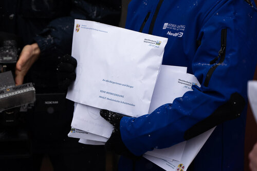 Sie dankte dem Zeitungsausträger Philipp Wiechmann, der den Neubau in der Bleichstraße auf seiner täglichen Route ansteuert, stellvertretend für die vielen Austräger*innen in Mecklenburg-Vorpommern, die die Masken bei winterlichen Verhältnissen in die Briefkästen werfen.