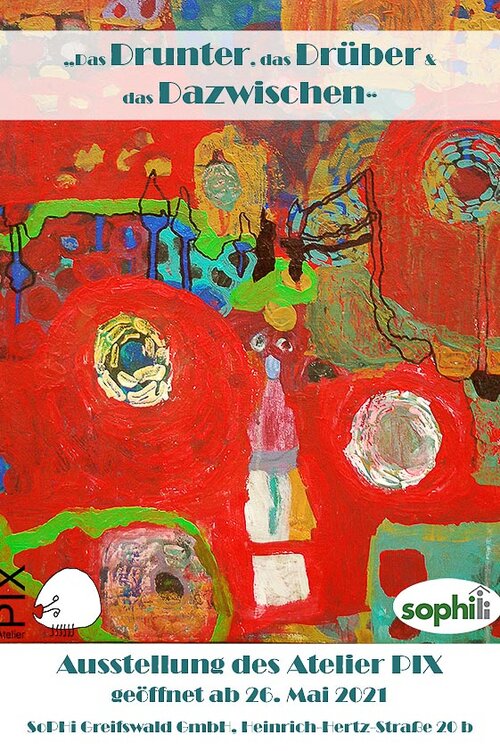 Ab dem 26.05.21 sind Sie herzlich eingeladen, einen Blick auf eine kleine Auswahl der PIX-Werke in der Geschäftsstelle der SoPHi Greifswald GmbH, Heinrich-Hertz-Straße 20 b in Greifswald, zu werfen. Angelehnt an diese unstete Zeit findet die neue Ausstellung der Greifswalder Künstler*innen unter dem Titel „Das Drunter, das Drüber & das Dazwischen“ statt und zeigt einen kleinen Querschnitt des PIX´schen Universums.