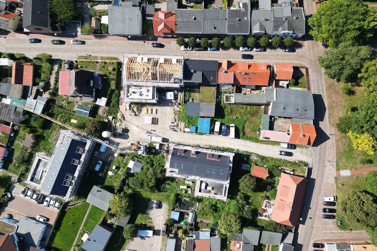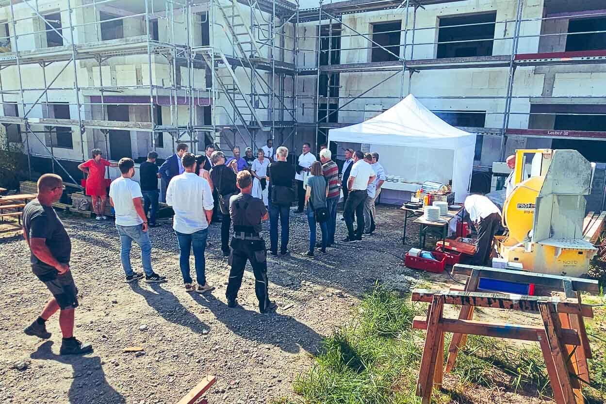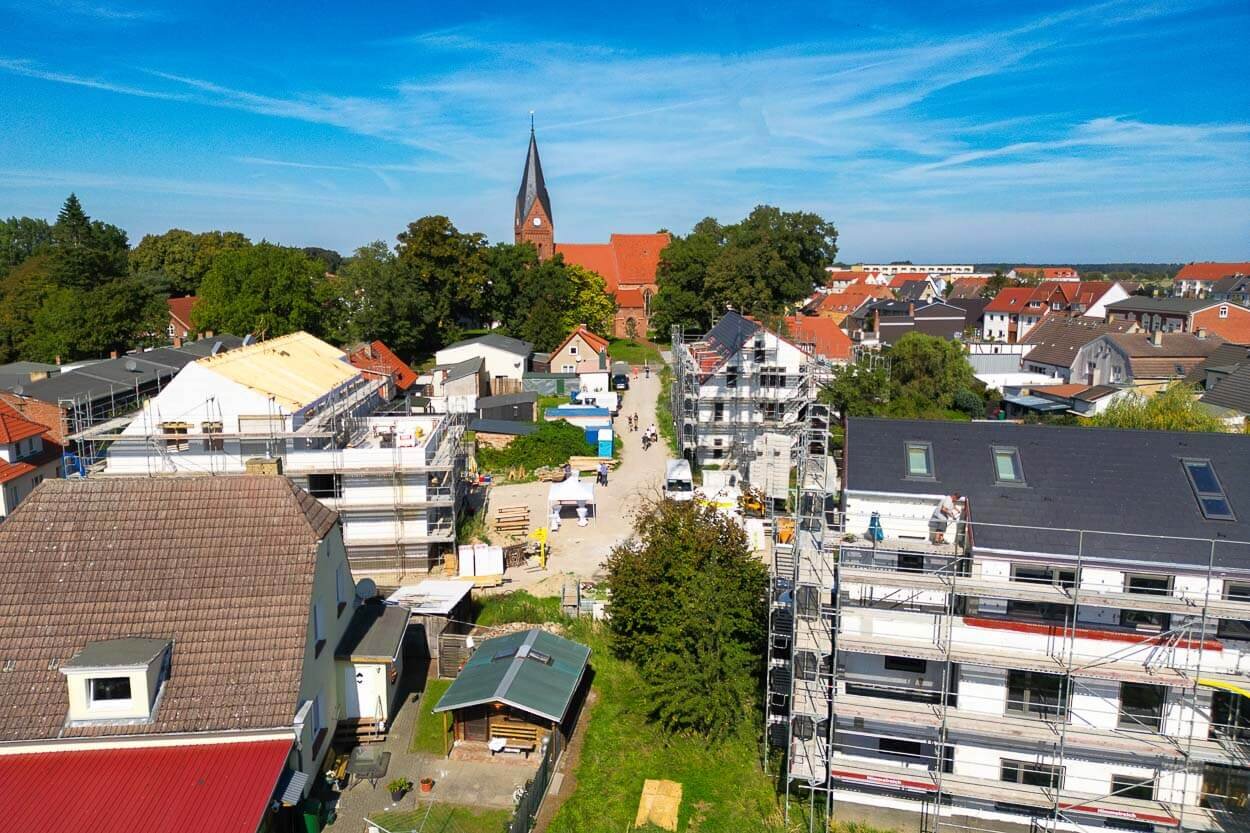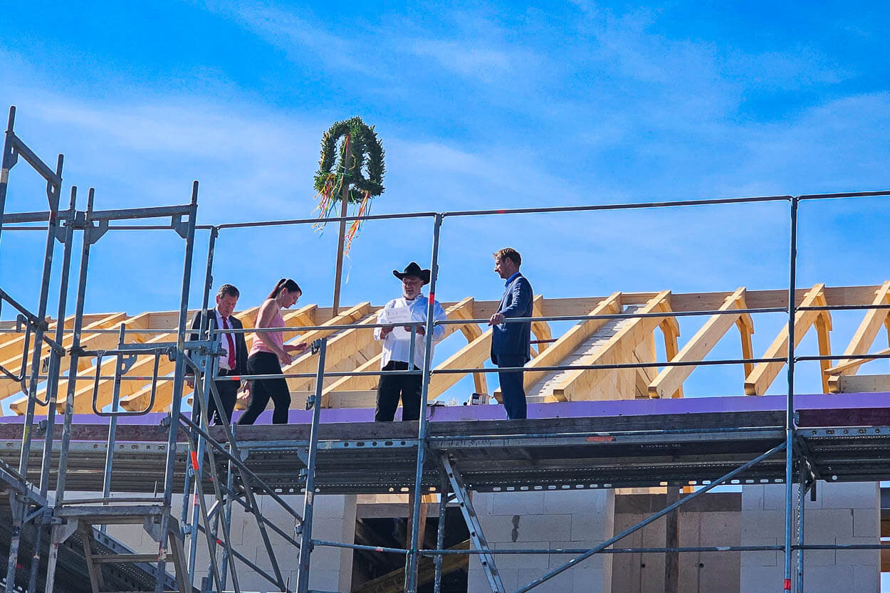 Im Zentrum von Damgarten errichtet der Pommersche Diakonieverein drei Mehrfamilienhäuser mit je acht Wohneinheiten in gehobener Ausstattung. Mit dem traditionellen Richtfest wurden am 07.09.23 die Fertigstellung des Rohbaus und die Einsetzung des Dachstuhls gefeiert. In einer kurzen Ansprache dankte Vorsteher Dr. Michael Bartels den beteiligten Gewerken, Planenden, Architekten und weiteren Gästen für den bisherigen Baufortschritt. Der zuständige Bauamtsleiter, Herr Körner, hob die Bedeutung des Baus für die Entwicklung des Damgartener Zentrums hervor. Es sei ein wichtiges Projekt für die Zukunft des Ortes und die Entwicklung von guten und zeitgemäßen Wohnmöglichkeiten - unweit der Küste. Anschließend wurde der Bau des Dachstuhls traditionell mit einigen letzten Hammerschlägen durch den Kaufmännischen Vorstand, Steffen Jaeckel, abgeschlossen. Der Zimmerermeister Herr Berger von der Firma Jantzen erinnerte daran, dass für jeden daneben gegangenen Hammerschlag eine Kiste Bier für die Zimmerer fällig sei. – Ob und wieviele Hammerschläge aber daneben gingen, blieb offen.