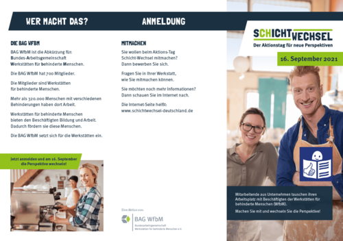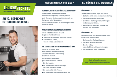 Mit der Teilnahme am Aktionstag Schichtwechsel möchten wir einen Beitrag dazu leisten, Barrieren abzubauen, Begegnungen zu schaffen, neue Perspektiven aufzuzeigen, Einblicke in die Vielfalt der Produkte und Dienstleistungen einer Werkstatt geben. Gleichzeitig haben die Beschäftigten der Werkstatt die Möglichkeit, in Berufsfelder des allgemeinen Arbeitsmarkts zu schnuppern. Über das verbindende Thema Arbeit schafft der Aktionstag so Raum für neue Perspektiven. (weiterführende Infos: BAG WfbM - Schichtwechsel 2021 - Perspektivwechsel auch in Krisenzeiten)