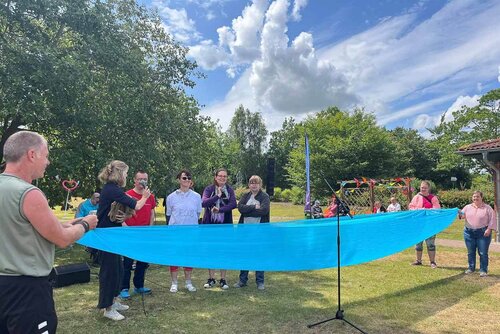 Endlich wieder eine "freshe" Erfahrung, hört man leise in der Menge, und somit ist der perfekte Start für eine wunderbare und gesegnete Zeit zusammen gemacht. Nach Fürbitten, Gebet und einem herzlichen Segen gab es live Musik von Seeside, der Band der Greifenwerkstatt, die kürzlich erst den Band Contest inklusiv gewonnen hat. Kurz vor ihrem Auftritt bei Andrea Bergs Heimspiel-Open Air erfüllen sie auch den Helmshäger Berg mit tollen Klängen und viele fröhliche Menschen strömen unter einem strahlend blauen Himmel auf die Tanzfläche.