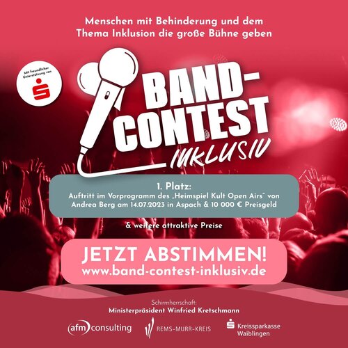 Das Jury-Urteil fließt allerdings nur mit 50 Prozent Gewichtung ins Gesamtergebnis ein. Über die anderen 50 Prozent entscheidet das öffentliche Publikumsvoting. Und an dieser Stelle sind Sie gefragt. Dazu einfach ab 13.06.2023 auf www.band-contest-inklusiv.de Video schauen und bis einschließlich 26. Juni 2023 abstimmen.
