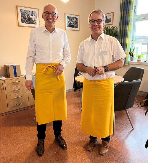 Und einer hat schon im letzten Jahr zugesagt und Wort gehalten: Am heutigen Tag wagte der Landespastor der Diakonie Mecklenburg-Vorpommern, Paul Philipps den Schichtwechsel. Mit weißem Hemd, Vorbinder und einem gewinnenden Lächeln fügt er sich nicht nur gut in das Team des Café Lichtblick ein, sondern er möchte auch tatkräftig das Mittagsgeschäft unterstützen.