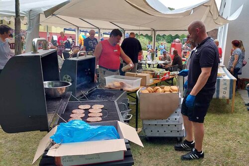 So langsam ist zu erkennen, was das Ganze wird, denn es treffen die ersten Besucher ein. Familienangehörige, Freunde, Betreuer, ehemalige Mitarbeitende. Nun denn - das Sommerfest im Ernst–Moritz–Arndt-Heim kann starten. Nach der Begrüßung und Ansprache durch die Regionalleitung folgt das musikalische Event der Bewohnenden, das großen Anklang bei den Besuchern findet und zum Mitsingen einlädt. Selbstgemachte Burger und Ketwurst sorgen für das leibliche Wohl, Cocktails lassen die Wärme erträglicher werden und schmecken wunderbar. An einem Stand können Blumenstecker gebastelt werden. Zwischendurch werden das Glücksrad (natürlich mit Preisen) und die anderen Spiele genutzt.