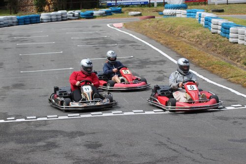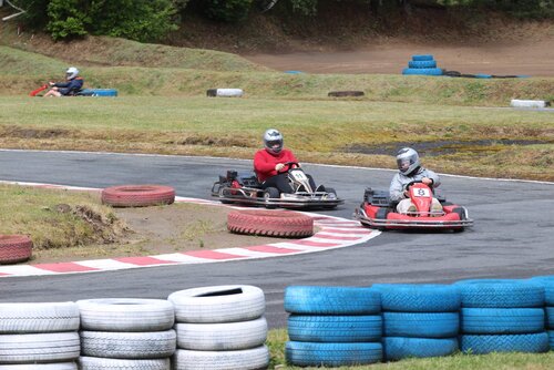 Gut ausgerüstet mit Kart und Schutzhelm, sorgte die noch feuchte Strecke bei den Jugendlichen für den einen oder anderen spaßigen Dreher. Je trockener die Bahn dann wurde, desto spannender wurden die Rennen, denn endlich konnte auch rasant überholt werden. Übrigens: Kart fahren ist eine ziemliche anstrengende Sache.