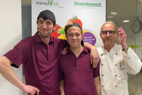 Die Mitarbeiter sind für viele kleine und größere Aufgaben im Mensabetrieb zuständig. Sie bereiten zum Beispiel das Gemüse für die Salattheke vor; das heißt, sie schnippeln, vierteln, halbieren, raspeln, schneiden, zerkleinern, füllen ab und auf und nach. Das ist nicht alles, denn die Essenbehälter müssen ein- und ausgeräumt werden und was kommt nach dem Essen … der Abwasch. Zwischendurch noch Tische abwischen. Und wie gut sie dabei aussehen, während sie voll in Action und freundlich mit einem Lächeln anpacken. Zwei weitere Mitarbeiter arbeiten in den Cafeterien beim Klinikum und der Mensa am Beitzplatz. Und wenn es nach allen Beteiligten geht, gehts damit auch gewünscht und gewollt weiter.