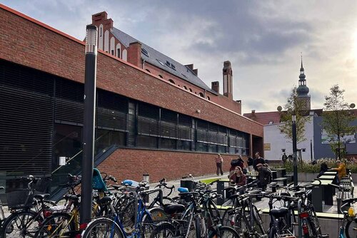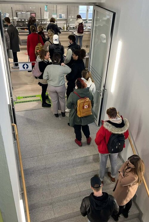 Langsam füllt sich die Mensa in der Friedrich-Loeffler-Strasse. Vorher haben wir gefragt, wann es günstig ist, zu kommen. „Am besten nach 11 Uhr“ sagt uns Herr Larisch, der seit 2017 nach einem Praktikum (zunächst noch in der Alten Mensa am Schiesswall) auf einem ausgelagerten Arbeitsplatz beim Studierendenwerk tätig ist. Seit 2018 gibt es die Mensa am Campus Loefflerstrasse mit 364 Plätzen auf 2 Etagen.