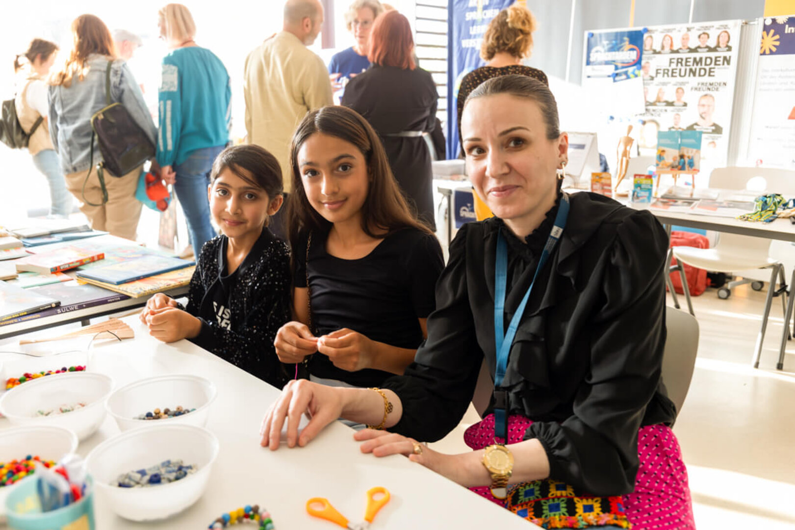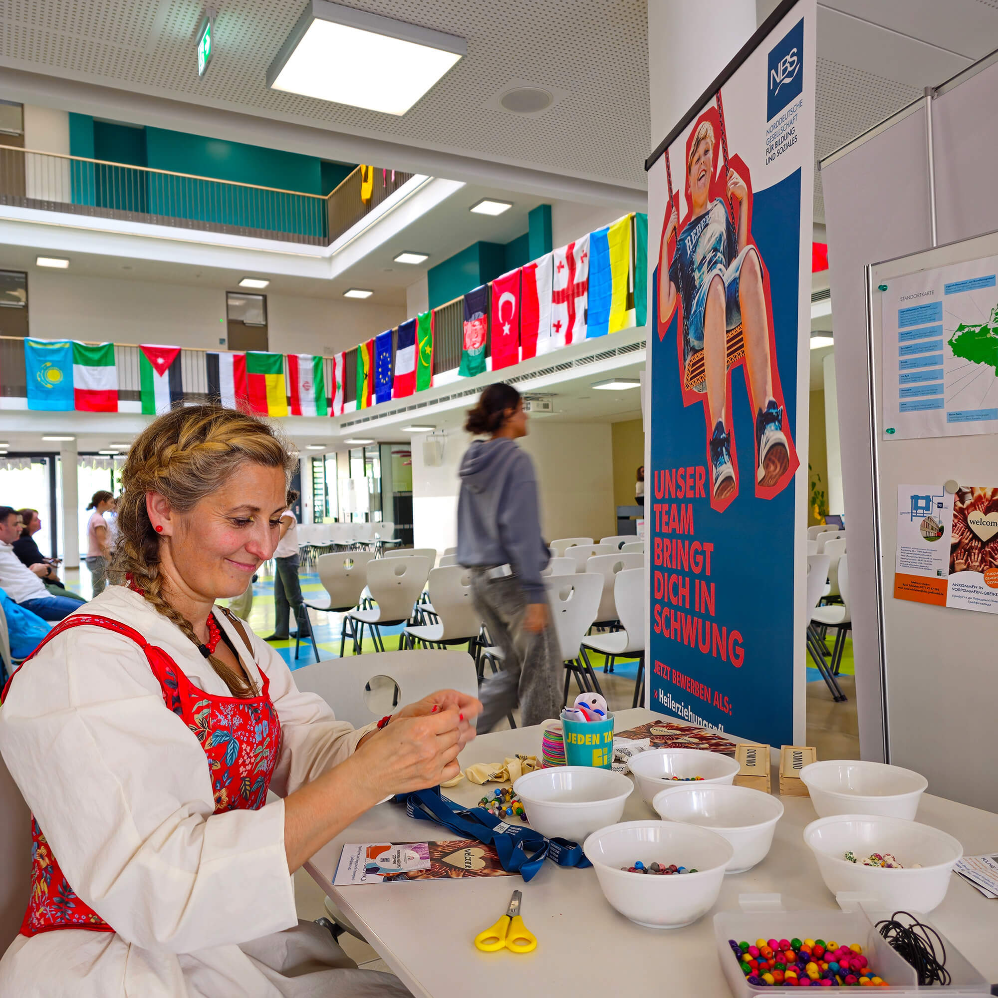 Die NBS lud dabei zum Gestalten von Perlenarmbändern mit handgefertigten Perlen aus der Greifenwerkstatt ein und die Sprach- und Kulturmittler:innen gewährten Einblicke in ihre Arbeit mit Menschen mit Migrationshintergrund.