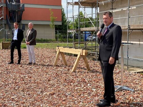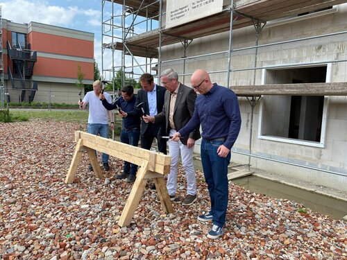 Vorsteher Dr. Michael Bartels und Regionalleiter Frank Jager nahmen die anwesenden Gäste in ihren Ansprachen mit auf einen Exkurs zum bisherigen Bauablaufgeschehen, Hintergründen für das aktuelle Bauprojekt und gaben Ausblick auf die künftige Inbetriebnahme des neuen Wohnangebotes.