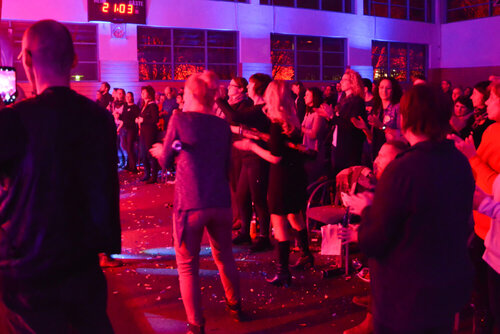 19:40. In einer Pause stärken sich die Gäste an einem Buffet in der kleinen Turnhalle des BerufsBildungsWerks nebenan. Auf langen Tafeln hat die Züssower Service und Catering große und kleine Häppchen, Spieße, gefüllte Blätterteigtaschen, Desserts, Getränke und vieles mehr vorbereitet. Man lässt es sich reichlich gut gehen. Das Ende der Pause wird durch einen lauten Schlag auf ein Becken angekündigt.