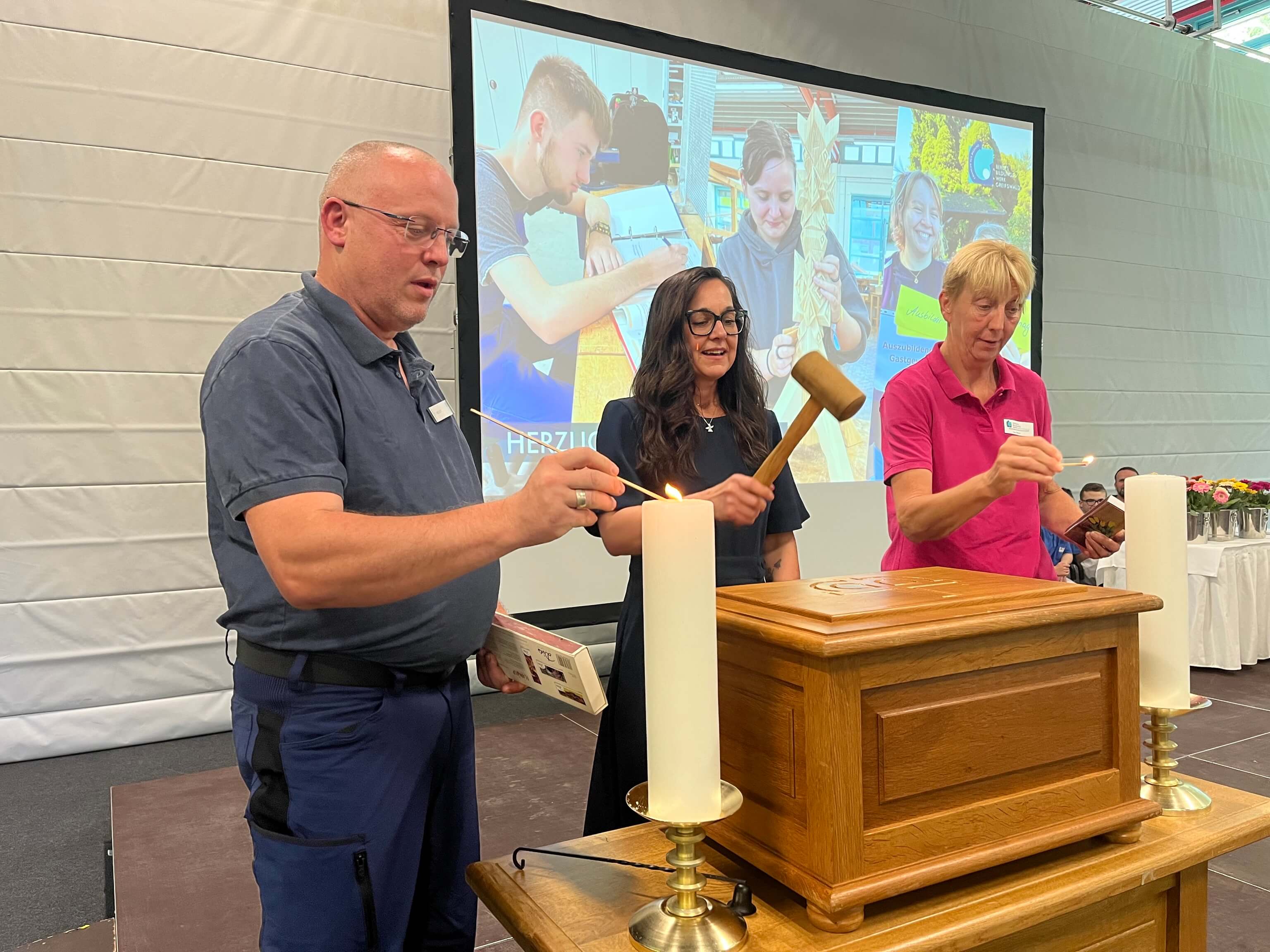 „Ausbildungsmeister – entzündet das Licht! In Ehrbarkeit, in Wahrhaftigkeit, in Gerechtigkeit“ – Mit diesen Worten von Bereichsgeschäftsführerin Stefanie Niemeyer wurde die feierliche Begrüßungszeremonie für 90 Auszubildende eröffnet. Dabei wurde die Gesellenlade geöffnet und Ausbildungsmeisterin Michaela Storm und Ausbildungsmeister Thorsten Heldt entzündeten zwei Kerzen. Die jahrhundertealte Tradition der Gesellenlade entstammt dem Handwerk. Früher war sie ein Symbol für die Zusammengehörigkeit der Gesellen einer Zunft. Heute ist sie eine schöne Tradition, die die feierliche Begrüßung im BBW Greifswald begleitet. Stefanie Niemeyer ergänzte, dass sich Formulierungen ändern mögen, der Kern aber bleibe: „Seien sie immer ehrlich, wertschätzend, verantwortungsbewusst und fair zueinander“, gab sie den Auszubildenden mit auf den Weg. Und: „Haben sie keine Angst davor, Fehler zu machen. Fehler darf und muss man selbst machen, um daraus zu lernen – nur das bringt uns weiter.“
