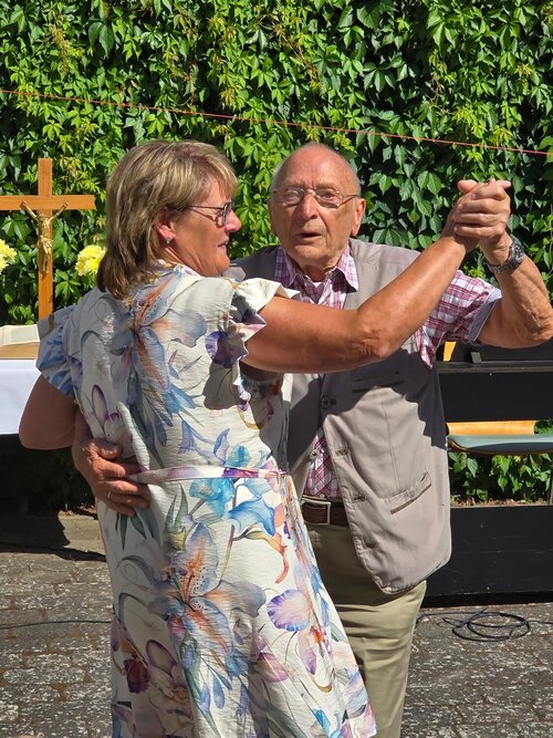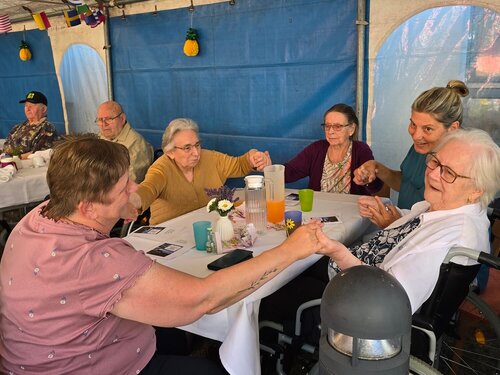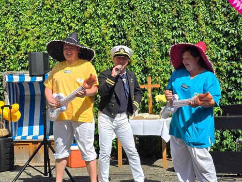 Einrichtungsleitung Birgitt Küthe, welche bereits seit der ersten Stunde im Haus tätig ist, ließ in ihrer Eröffnungsrede die letzten 30 Jahre Revue passieren und erinnerte sich an viele schöne und bewegende Momente. Natürlich nahm auch unser Vorstand, Dr. Michael Bartels, an der Veranstaltung teil und begann die Feierlichkeiten mit einer Andacht. Im Anschluss gab es für die rund 150 Besucher*innen, unter denen natürlich auch die Bewohner*innen des Hauses, die Mieter des Betreuten Wohnens am Markt sowie viele ehemalige Mitarbeitende waren, Kaffee und Kuchen. Musikalisch begleitet wurde das Sommerfest durch den „Blonden Hans“, der die Gäste mit vielen bekannten Schlagern und Volksliedern begeisterte. Immer dabei: die Mitarbeitenden des Pflegeheims, die sich schon im Vorfeld organisatorisch und kreativ ins Zeug gelegt hatten. Sie schmückten die Einrichtung, begleiteten die Bewohner*innen zur Feier, legten Kuchen auf, schenkten Getränke ein, verteilten Eis, verkleideten sich entsprechend dem Motto „Sommerreise“ und brachten mit ihren Showeinlagen die Gäste zum Schmunzeln. So wurde es ein bunter Nachmittag mit toller Stimmung, der von allen Teilnehmenden mit Genuss und Leichtigkeit zelebriert wurde.