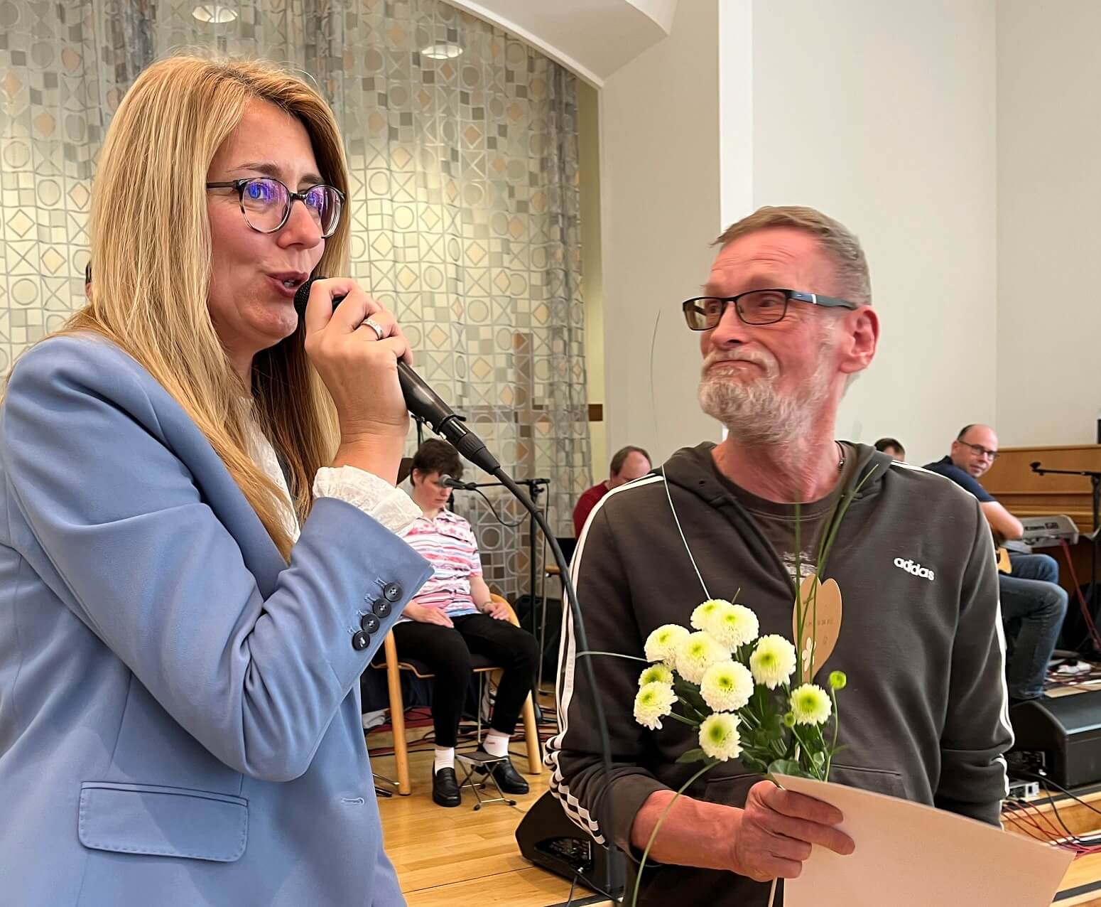 Paul, einer der neuen Leistungsberechtigten, stand erstmals auf der Bühne und fesselte das Publikum mit seiner Energie und Stimme. Erinnerungen an die ersten Handys mit Tasten kamen auf und zur gleichen Zeit an die Gründung der Betriebsstätte Feldstraße. Und nicht zuletzt, und als einer der Höhepunkte, der Blick zurück ins Jahr 1985, als in Greifswald vier Menschen in einer geschützten Abteilung begannen. Heute, 40 Jahre später, wurde als einer von ihnen Herr Stump geehrt.