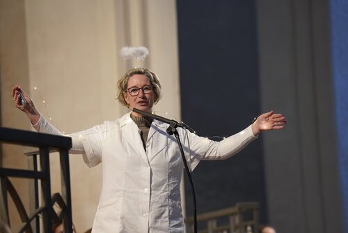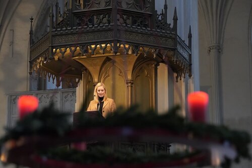 Einen solchen Weihnachtsgottesdienst hat die Unternehmensgruppe Pommersche Diakonie (UGPD) wohl noch nie gefeiert. Nahezu alle Plätze auf den Bänken und zusätzlich aufgestellten Stühlen im Kirchenschiff des Greifswalder Doms St. Nikolai waren mit Beginn des Orgelspiels besetzt. In der weihnachtlichen Stimmung lag die gespannte Vorfreude auf die diesjährige Darbietung der Weihnachtsgeschichte. Alljährlich wird diese während des Gottesdienstes durch Mitarbeitende und auch Leistungsberechtigte aus den Geschäftsbereichen der UGPD vorbereitet. In diesem Jahr durch die Mitarbeitenden und Auszubildenden des Geschäftsbereichs pflegen, die die Gäste auf eine moderne und lebendige Reise von Maria und Josef durch die heutige Pflegelandschaft zur Geburt von Jesus im Pflegeheim mitnahmen. Einen Ort an dem der Tod ein und ausgeht. Und hier soll sich DIE Geburt ereignet haben? Pastor Dr. Michael Bartels knüpfte in seiner Predigt an diesen Gedanken an, denn den Menschen, die vor über 2000 Jahren über die Geburt Jesus in einem Stall erfuhren, hielten diesen genauso, wie wir heute das Pflegeheim zunächst für einen Ort, an welchem so ein Ereignis nicht stattfinden kann. Die Auszubildenden haben es auf eine großartige Weise geschafft, die Weihnachtsgeschichte in die Gegenwart zu holen und diese Geschichte zur lebendigen Wahrheit im Alltag in Worten und dem was wir alltäglich tuen zu platzieren. Eine Darbietung, die dieses tiefgreifende Thema mit einer Leichtigkeit vermittelte und es gleichzeitig schaffte mit den Herausforderungen der Pflege zu verbinden. Und auch wenn es für einen Gottesdienst wohl eher unüblich ist, der spontan einsetzende Applaus, würdigte das Engagement und die Leidenschaft, jeden Tag für andere da zu sein, der Darbietenden gebührend. Danke für diese Weihnachtsgeschichte. Danke, dass wir so einen belebenden Gottesdienst feiern durften. Danke, dass ihr da seid. Jeden Tag.