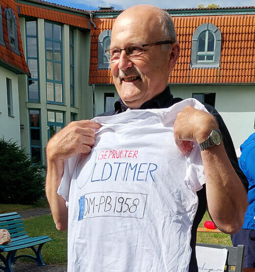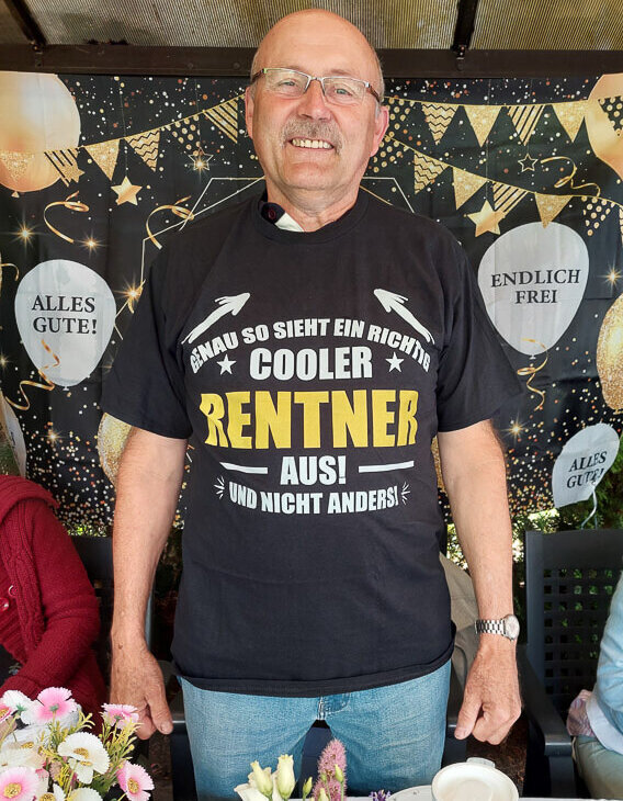Wie es sich für ein echtes technisches Multitalent wie ihn gehört, konnte dies natürlich nicht nur im Rahmen einer Kaffeetafel geschehen. So hatten die Kolleginnen und Kollegen sich etwas ganz Besonderes ausgedacht und es wurde noch eine „TÜV-Prüfung“ an dem zukünftigen Rentner vorgenommen, um seinen neuen Status als „Oldtimer“ zu bestätigen. Diese Prüfung bestand er selbstverständlich mit Bravour und erhielt daher auch seine Prüfplakette in Form eines von den Mitarbeitenden, extra für ihn, angefertigten T-Shirts.