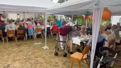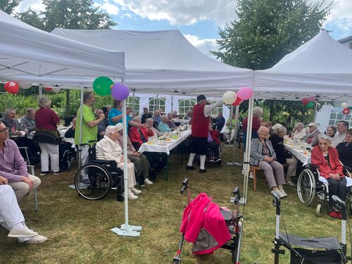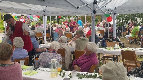 Zur Mittagszeit warteten unter schattigen Pavillons leckere Klassiker auf die Gäste: Kartoffelsalat, herzhafte Bouletten und frischer Gurkensalat stärkten die Teilnehmenden und boten Raum für anregende Gespräche in entspannter Atmosphäre. Regionalleiter Herr Pahl würdigte in einer Ansprache die Bedeutung solcher Begegnungen und wünschte allen einen unterhaltsamen und fröhlichen Nachmittag. Und der wurde musikalisch zum echten Highlight: Ein Double der „Wildecker Herzbuben“ sorgte mit bekannten Schlagern für Stimmung, Lebensfreude und viele Mitsingmomente. Das Publikum ließ sich mitreißen – zwischen Ohrwürmern und Applaus lag eine Energie, die spürbar war. Bei duftendem Kaffee und Kuchen klang der Tag in geselliger Runde aus. Es wurde erzählt, gelacht und gemeinsam der Moment genossen. So wurde auch dieses Sommerfest wieder ein echter Erfolg.