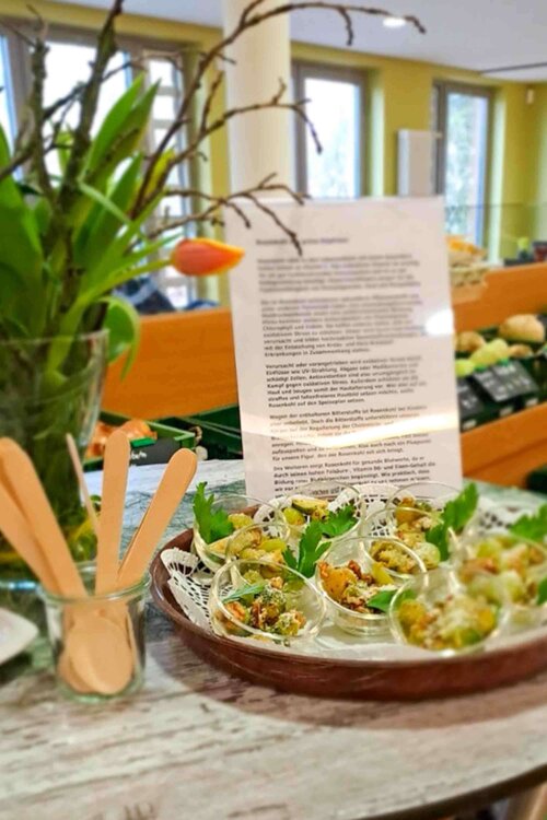 Unter dem Motto „Rosenkohl – grünes Köpfchen“ fand der erste Aktionstag im Ostseeländer Hofcafé und im Naturkostladen Pommerngrün statt. Passend zur kalten Jahreszeit wurden die Gäste mit einer köstlichen Rosenkohlsuppe mit Kokosmilch und einer herzhaften Rosenkohlpfanne, verfeinert mit einer Frischkäse-Senfsoße und Parmesan, verwöhnt. Ein Verkostungstisch bot die Gelegenheit, Rosenkohlsalat mit Trauben und Walnüssen zu probieren, was zum Kauf der kleinen Röschen anregte.