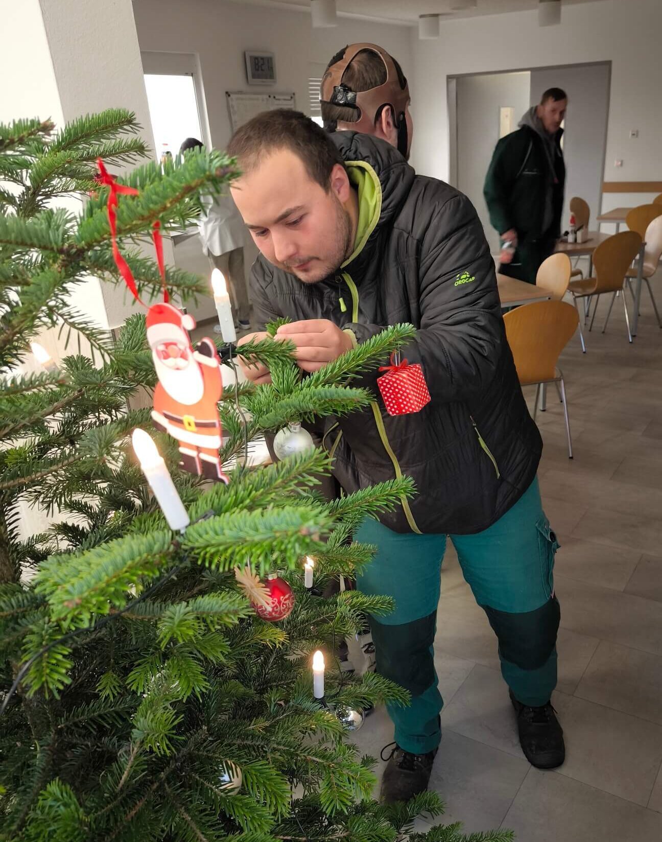 Heute Vormittag herrschte im Haus A des Geschäftsbereichs arbeiten des Pommerschen Diakonievereins in Züssow eine ganz besondere Stimmung. Die Tagesgruppe, die Hauswirtschaft und der Garten- und Landschaftsbau-Bereich kamen zusammen, um den Weihnachtsbaum festlich zu schmücken. Schon beim Betreten des Raumes war die Vorfreude spürbar, überall lagen glänzende Kugeln, funkelnde Sterne und bunte Schleifen bereit.