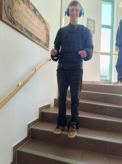 Im zweiten Teil der praktischen Selbsterfahrung stand die Frage: „Wie fühlt sich eigentlich ein älterer Mensch?“ im Fokus. Hierzu konnten die Besucher*innen unseren „Alterssimulationsanzug“ ausprobieren. Die Schüler*innen stiegen Treppen und gingen mit Hilfe eines Rollators über Steine, Sandwege und Bordsteinkanten. Dieser Kraft- und Koordinationsaufwand brachte bei vielen die Erkenntnis, was eine eingeschränkte Bewegung im Alter bedeuten kann. Auch die Tremor-Handschuhe, die die Symptomatik eines Parkinsonpatienten simulieren sollen und bei den Tragenden ein heftiges Zittern verursachen, erzeugten ebenfalls großes Interesse. Wie soll man damit noch schreiben oder einen Bonbon aus dem Papier wickeln können?