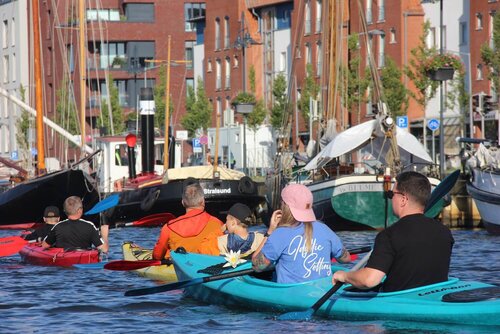 Begleitet von Herrn Mahlitz, IGT Partnerschaft mit dem GB arbeiten, erhielten alle zu Beginn eine kurze Einweisung in die Paddeltechnik und Einstellen der Boote. Anschließend ging es in Zweier-Kajaks aufs Wasser. Die Route führte vorbei an grünen Ufern, historischen Gebäuden und bot einen einmaligen Blick auf die maritime Seite Greifswalds. Die Tour bot genügend Momente zu Gesprächen im Boot, Feilen an der Paddeltechnik, denn nicht allen Teilnehmern/innen gelang es das Kajak auf geraden Kurs zu halten. Zum Teil kollidierten wir anfangs mehr mit der Uferböschung und pflügten den Ryckuntergrund dermaßen auf, dass uns die Seerosen und Algen um die Ohren flogen.