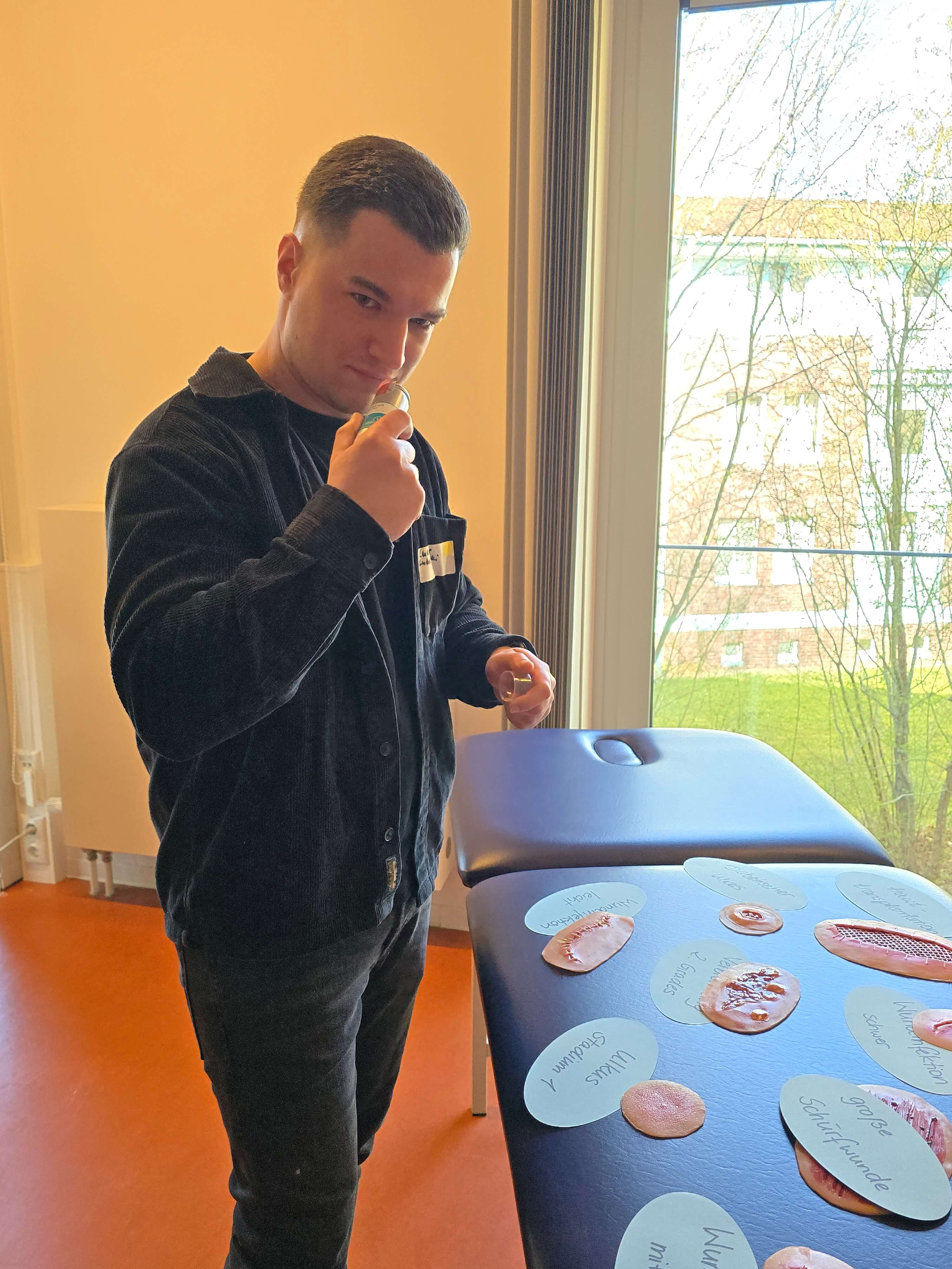Der erste Tag begann diesmal jedoch mit einem Besuch des neuen Schulungszentrums an der Gesundheits- und Pflegeschule der Wirtschaftsakademie Nord. Geschäftsführer Dr. Olaf Martin begrüßte alle Anwesenden und lud anschließend dazu ein, die neu eingerichteten und technisch gut ausgestatteten Räumlichkeiten zu besichtigen und bei der Gelegenheit auch die verschiedenen Schulungsschwerpunkte auszuprobieren. Angeleitet wurden die Teilnehmenden hierbei durch die Lehrkräfte der Schule. Von Reanimation und Notfallmedizin, über Wundmanagement, bis hin zu dem Testen eines Alterssimulationsanzugs war das Mitmachangebot vielfältig. Wir erhielten so einen Eindruck davon, was unsere Auszubildenden innerhalb der Schulturnusse vermittelt bekommen und welche Fortbildungsthemen die Wirtschaftsakademie auch für unsere Bestandsmitarbeitenden anbieten könnte.