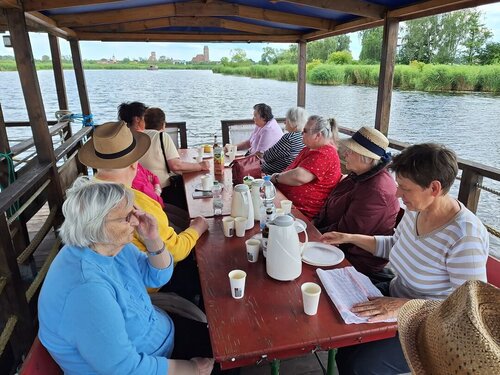Die Kunden des Nikolaiheims hatten daher einiges zu gucken, während sie mit den Flossen „Elli1“ und „Elli2“ unterwegs waren. Die Tour wurde durch einen Ranger begleitet, der jede Menge Wissenswertes zu Flora und Fauna enthüllte. Bei Kaffee und Kuchen erfuhren die Senioren*innen während der Floßfahrt daher viel Neues über die Natur der eigentlich lang bekannten Heimat. Nebenbei genossen sie die frische Luft, die wärmenden Sonnenstrahlen und die Ruhe der Natur.