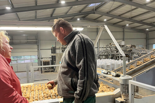 Weiter geht’s an diesem Tag von Wolgast nach Züssow. Nun geht's die Treppen hinauf zur Kartoffelsortiermaschinenanlage im KLH Kartoffellager & Handels- Zentrale GmbH in Züssow. Herr T. ist bereits seit einiger Zeit im Praktikum und sucht routiniert die Kartoffeln mit Flecken raus. Wir staunen, wie er das macht und er strahlt und bekräftigt mehr als einmal, dass er sich diesen Erprobungsplatz als dauerhaften ausgelagerten Arbeitsplatz wünscht. Frau Dell, Integrationsassistentin, nutzt den Weg, die Zeit und die Gelegenheit, um schonmal die Absichten mit dem Unternehmen zu besprechen.