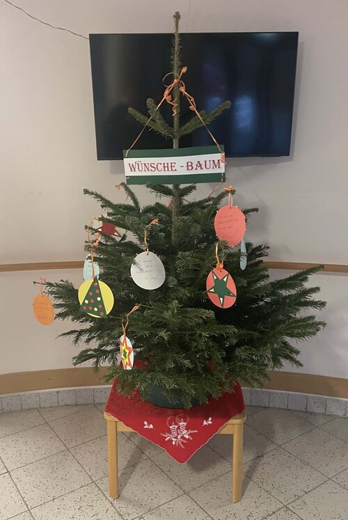 Das Betreuungsteam des Gützkower Pflegeheims hat sich in diesem Jahr etwas ganz Besonderes für seine Bewohner*innen einfallen lassen. Im Eingangsbereich des Hauses steht während der Adventszeit ein „Wünschebaum“. Die Idee dahinter ist simpel: Jede*r Bewohner*in darf einen Wunsch (oder auch mehrere) auf eine der vorbereiteten „Kugeln“ schreiben und ihn an den Baum hängen. Dieser Wunsch wird dann von den Angehörigen oder Mitarbeitenden der Einrichtungen erfüllt und am Heiligabend eingelöst.