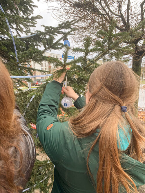Trotz Wind und Wetter wurde der Baum liebevoll geschmückt und erstrahlt nun in weihnachtlichem Glanz. Wir hoffen, dass er den Bewohnerinnen des Sozialraums ein Lächeln ins Gesicht zaubert.