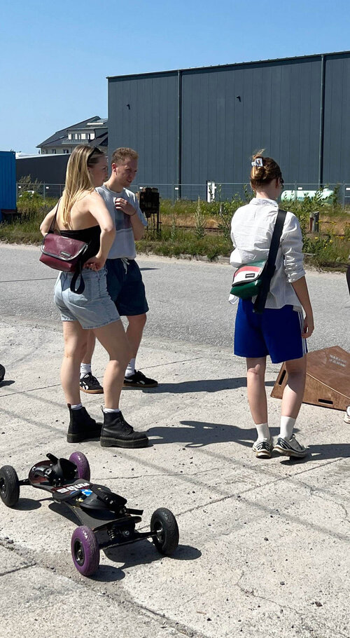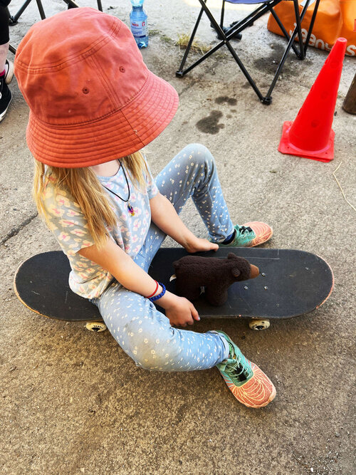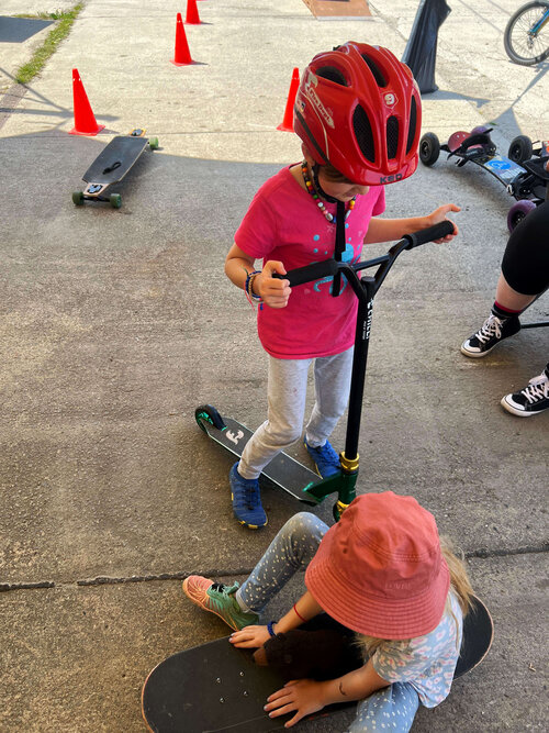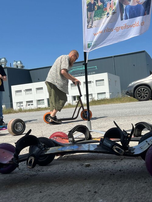 Die Wagemutigen sind eingeladen, sich beim Skaterprojekt auszuprobieren. Ob Starter oder Fortgeschritten, jeder darf mal auf den Scooter, das Skateboard oder eines der anderen Geräte steigen. Und das findet auch richtig Anklang – die Kinder und Erwachsenen leben ihren Spieltrieb aus und übertreffen sich gegenseitig. Mit dabei und vorneweg der betreuende Erzieher Felix, der die Fahrgeräte natürlich alle beherrscht und vorführt.