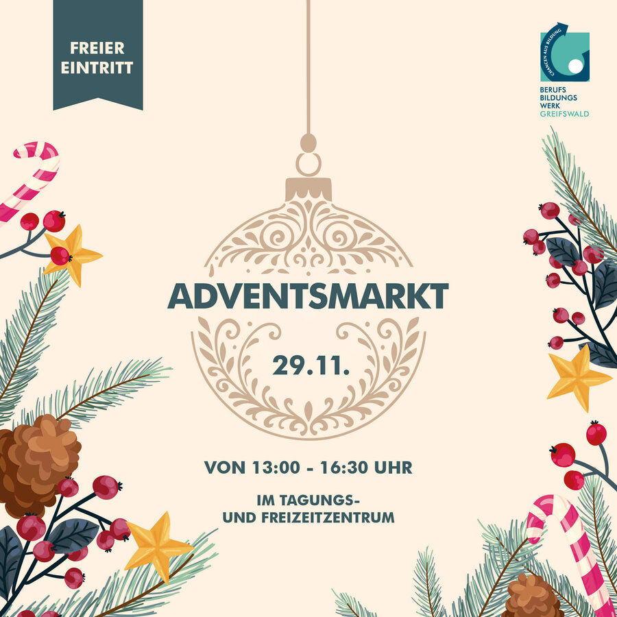 Mit einem stimmungsvollen Adventsmarkt am Samstag, 29. November 2025, startet das Berufsbildungswerk Greifswald in die Weihnachtszeit. Von 13.00 bis 16.30 Uhr lädt das Tagungs- und Freizeitzentrum in der Pappelallee 2 Besucherinnen und Besucher jeden Alters zum Genießen, Staunen und Mitmachen ein.