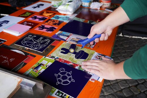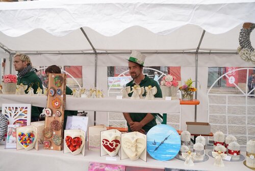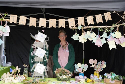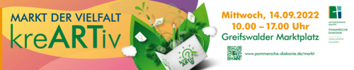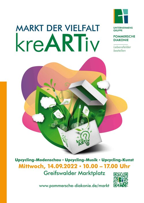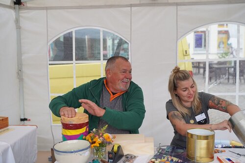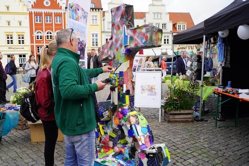 In diesem Jahr stand die Veranstaltung unter dem Motto kreARTiv. Ein buntes Angebot an Informations- und Mitmachständen mit dem Fokus Nachhaltigkeit, Upcycling und Klimaneutralität warteten auf die zahlreichen Besucher des Marktes. So lud die arbeitstherapeutische Trainingsmaßnahme Sprungbrett alle Vorbeikommenden dazu ein, sich an der Gestaltung einer Upcycling-Skulptur mit zuvor aus dem Ryck gefischtem Müll zu beteiligen. Beim Geschäftsbereich assistieren konnten die Besucher aus Stoffstreifen tolle Armbänder flechten, während das Interkulturelle Nähkaffee des Bürgerhafens nebenan Inspiration für die nächste selbst genähte Upcycling Handtasche gab.