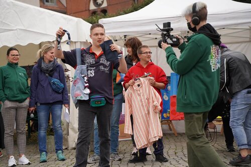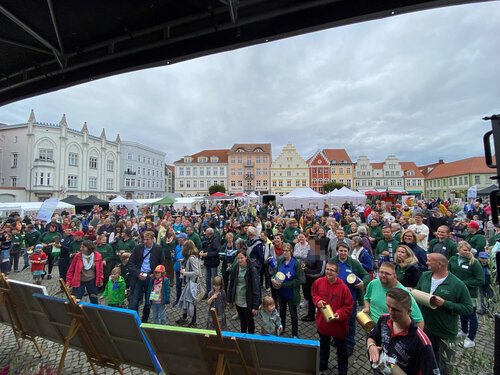 Musikalisch kreARTiv ging es auch bei unserer Stadtwette zu. Wir haben gewettet, dass wir es schaffen, 100 Leute mit selbstgebastelten Instrumenten oder Alltagsgegenständen, die als Instrument genutzt werden, vor unsere Bühne auf den Greifswalder Markt zu locken und mit uns gemeinsam den Song Don`t worry, be happy zu musizieren. An Instrumenten war alles erlaubt, was Töne erzeugt. Wer keins dabei hatte, hatte die Möglichkeit, direkt auf dem Markt, beim Stand des Berufsbildungsbereichs, eines zu basteln. Der Upcycling-Gedanke stand dabei im Vordergrund. Der Jubel war dann kurz nach 16:00 Uhr groß, als Moderator Andreas Baschwitz verkündete, dass die Pommersche Diakonie die Wette gewonnen hat. Musikalisch begleitet wurde die Aktion von der Band Seeside.
